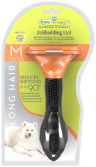 – Фурминатор для вытаскивания отмерших волосков подшерстка. Это приспособление значительно сокращает период линьки, препятствует появлению скомканной шерсти и попаданию ее в желудок питомца.
