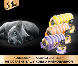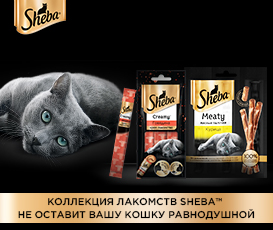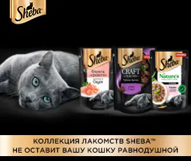 Sheba — производитель повседневных универсальных кормов для кошек разных возрастов и пород. Компания выпускает сбалансированные рационы, приготовленные из натурального мяса и субпродуктов: курицы, индейки, говядины, кролика, ягненка, лосося, креветки.