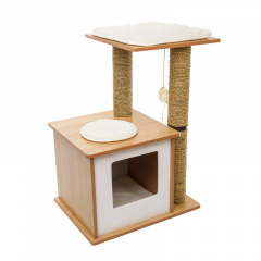 В производстве таких домиков используется ДСП, МДФ, дерево, обитые мягким искусственным мехом, фетром, плотным войлоком, плюшем. Столбики обтянуты сизалевой или джутовой веревкой — прочные материалы, которые выдержат любые кошачьи когти.