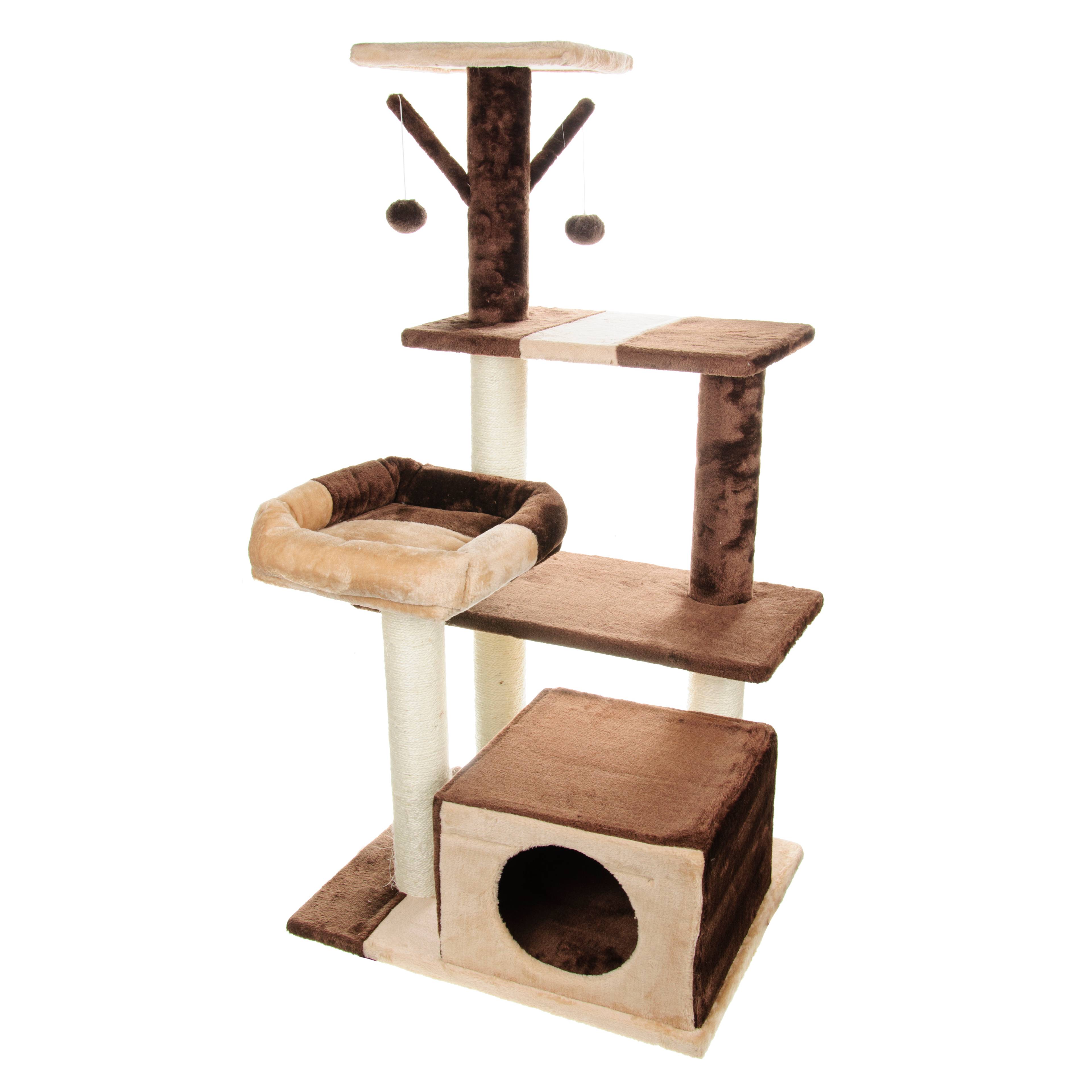 Petmax Игровой комплекс для кошек с домиком и когтеточкой CATRIN, с площадками и игрушками, бежевый/коричневый, 61х49х117 см