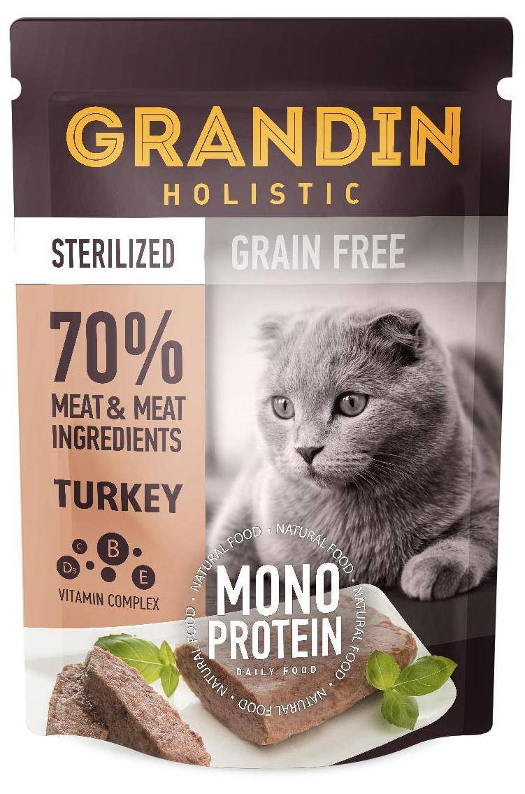 - Grandin корм для кастрированных и стерилизованных кошек из нежного мяса индейки в желе - монопротеиновый влажный корм для кошек создан на основе свежего мяса индейки.