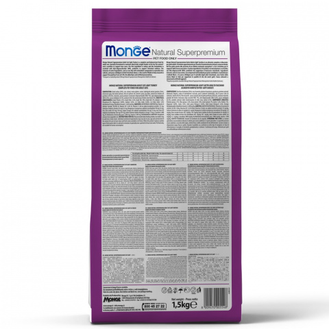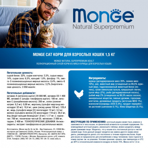 Monge Cat корм для взрослых кошек - полноценный сбалансированный рацион для взрослых кошек в возрасте от 1 года до 7 лет. Высокий уровень белка в составе корма и содержание в нем L-карнитина позволяет кошке долгие годы сохранять активность и хорошую физическую форму. Содержит важнейшие антиоксиданты, такие как витамин Е, для поддержания иммунной системы.