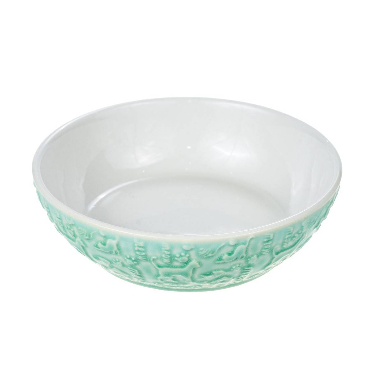 Миска для кошек и собак керамическая, белая внутри, с фактурным узором на внешней стороне миски зеленого цвета, диаметр 11,5 см.