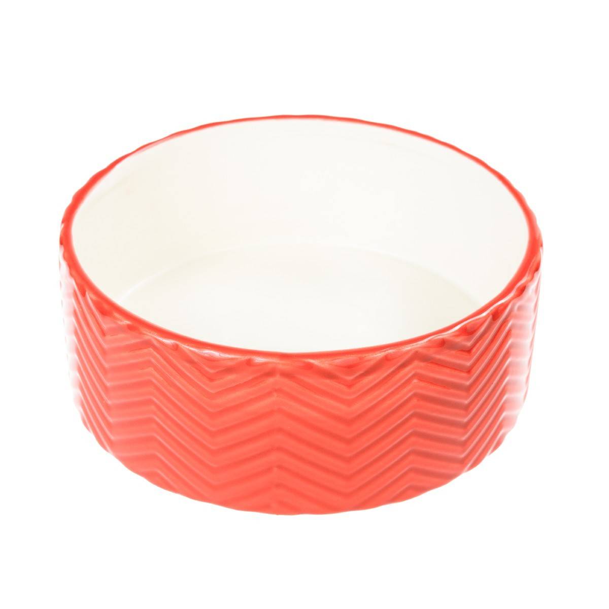Миска для кошек и собак керамическая, белая с внутренней стороны, с красным фактурным рисунком на внешней стороне, диаметр 16 см.