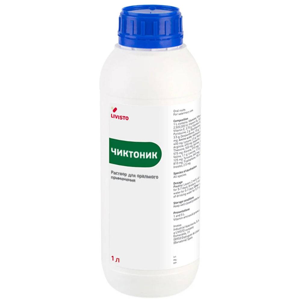 Чиктоник — комплексный витаминно-аминокислотный препарат, регулирующий оптимальное соотношение этих биологически активных соединений, поступающих в организм животных и птиц. Препарат благодаря наличию сбалансированного количества водо-, жирорастворимых витаминов и незаменимых аминокислот, восполняет дефицит этих элементов в организме животных и птиц, способствует нормализации обмена веществ и энергии.