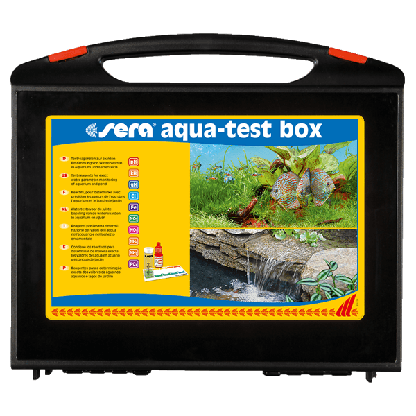 Sera Aqua-Test-Box (+Cl) - набор тестов  для вычисления параметров воды в аквариуме. Удобный и практичный комплект соответствующих тестов для воды, доступный в версиях для пресной и морской воды – идеальный профессиональный набор для аквариумиста и владельца пруда.