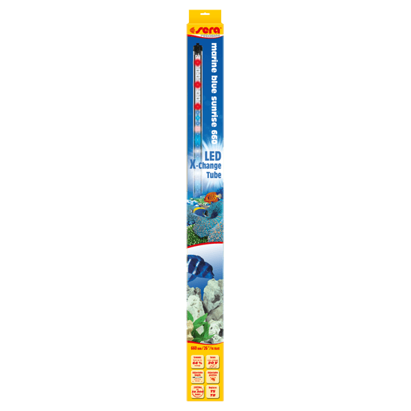 Sera LED Marine Blue Sunrise 660 мм 14W 20 V - светодиодная лампа голубого цвета, естественного для рифов в морских аквариумах. Усиливает эффект флуоресценции. Подойдет для создания дополнительного освещения или создания эффекта лунной ночи.