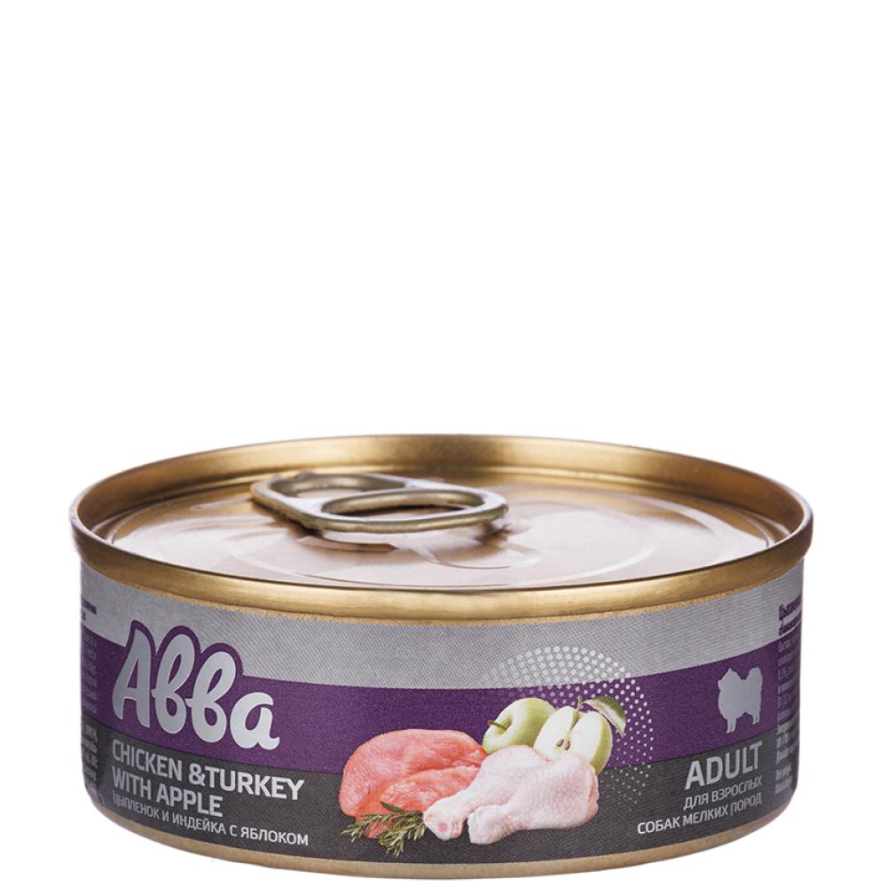 4.9105 ₽АВВА Adult Влажный корм (консервы) для взрослых собак мелких пород, с цыпленком и индейкой с яблоком, 100 гр.