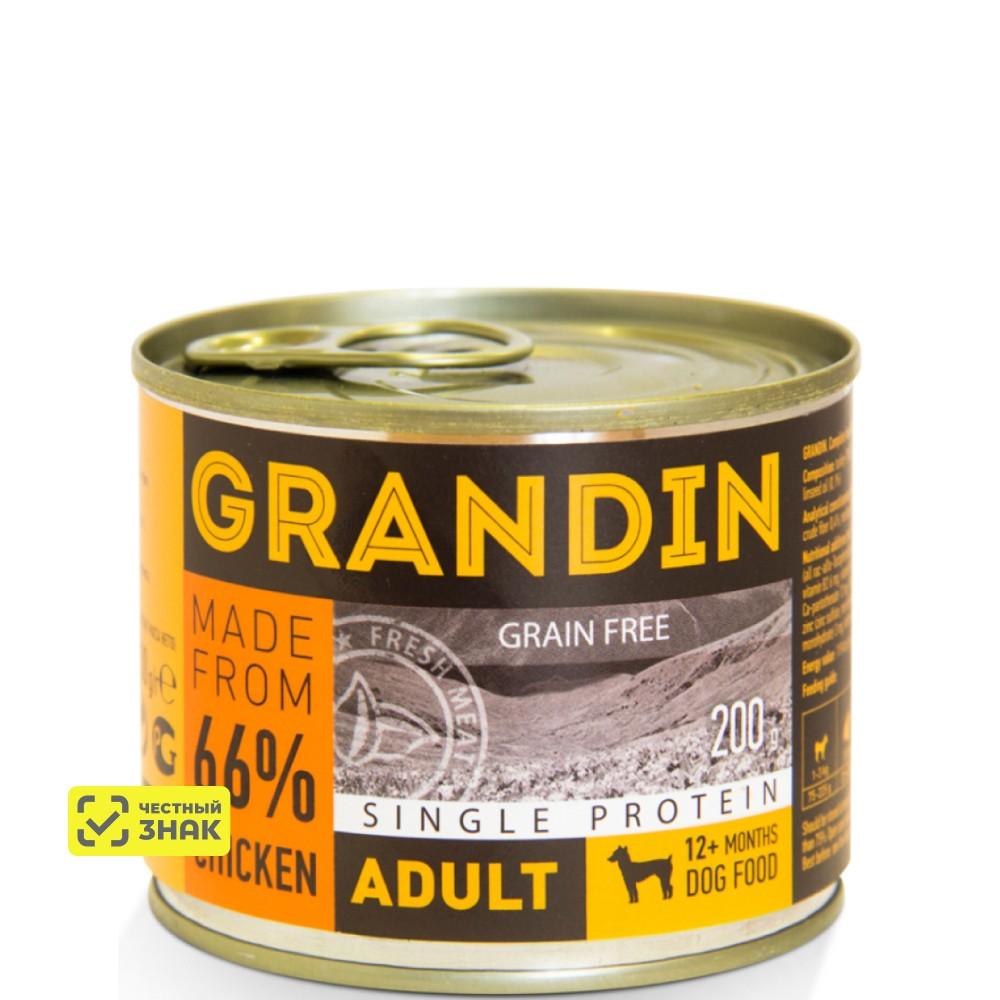 5187 ₽Grandin Adult Влажный корм (консервы) для взрослых собак всех пород, с курицей и льняным маслом, 200 гр.200 г400 г
