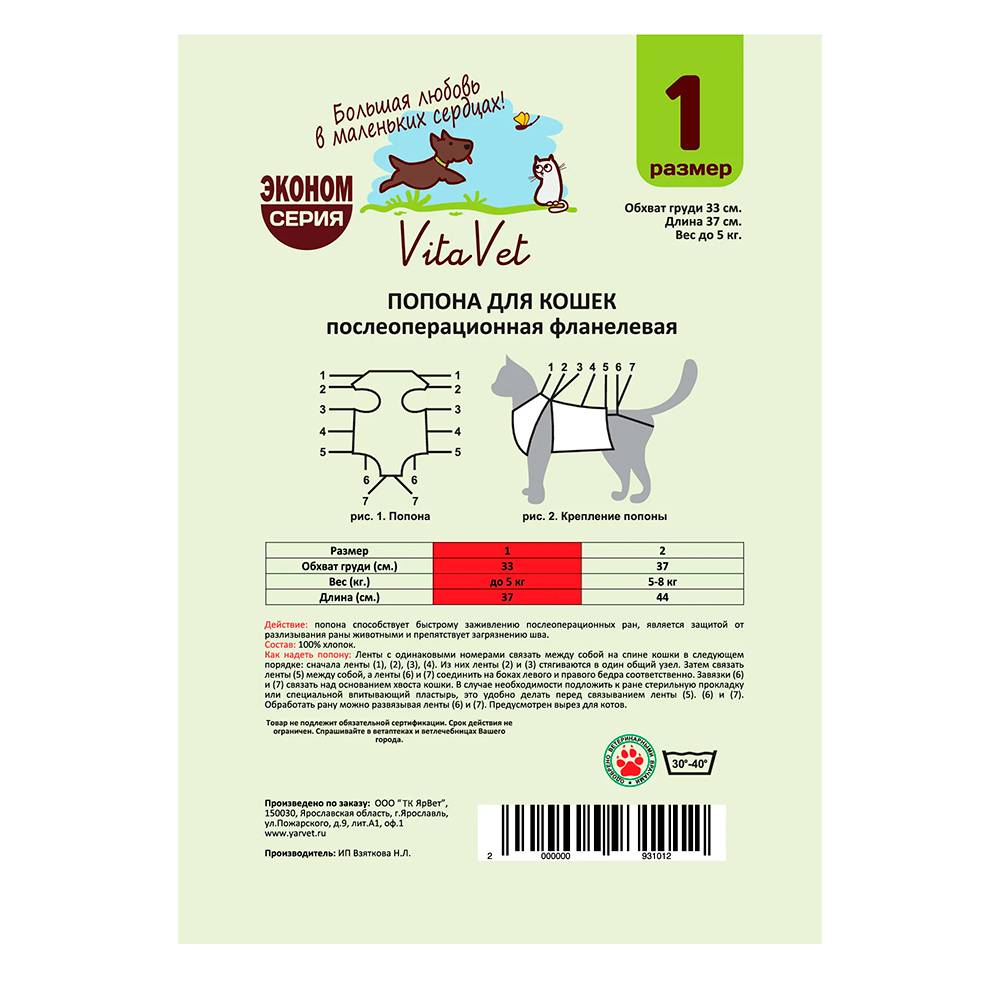 VitaVet Попона послеоперационная для кошки фланелевая №1 малая