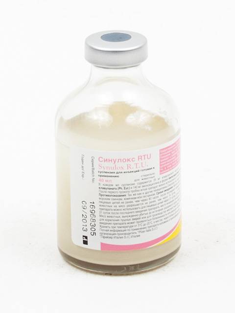 Синулокс RTU суспензию для инъекций вводят крупному рогатому скоту и свиньям только внутримышечно, собакам и кошкам — внутримышечно или подкожно из расчета 8,75 мг на 1 кг веса животного, что эквивалентно 1 мл препарата на 20 кг веса животного, 1 раз в сутки в течение 3 – 5 дней. Перед каждым использованием содержимое флакона тщательно встряхивают до получения однородной суспензии. Для введения препарата используют только сухие шприцы и иглы. Место инъекции после введения Синулокса RTU рекомендуется слегка помассировать.