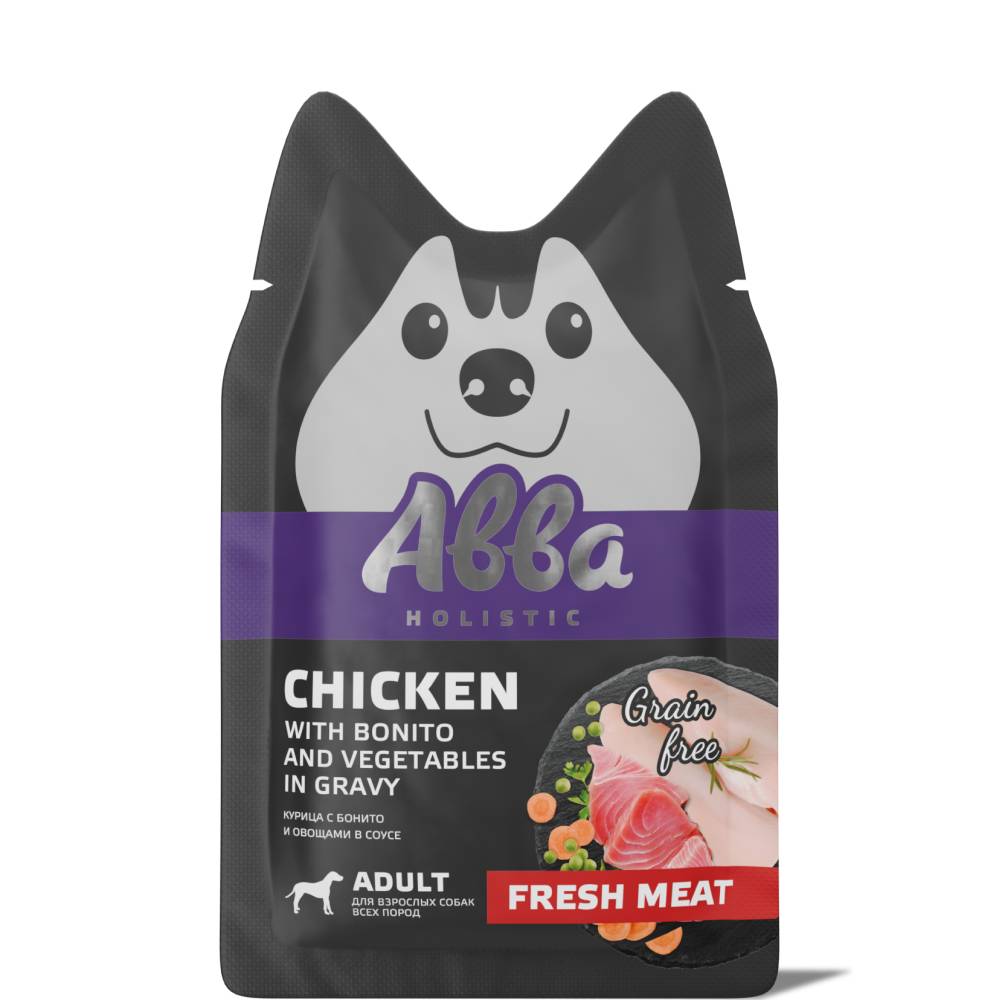 АВВА паучи с курицей, бонито и овощами в соусе - полнорационный влажный корм для собак всех пород. Нежные волокна в аппетитном соусе, приготовленные до идеально мягкой консистенции, подарят истинное удовольствие вашему питомцу.