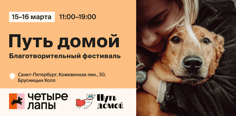 Друзья, приглашаем вас на фестиваль «Путь домой», который состоится 15-16 марта в Санкт-Петербурге. Этот благотворительный проект традиционно собирает вместе людей, неравнодушных к судьбе бездомных хвостиков — сотрудников и волонтеров приютов, а также всех тех, кто мечтает о том, чтобы каждая собачка и кошечка нашли свой дом и семью!