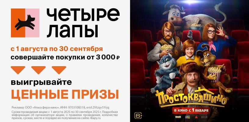 Совместно с кинопрокатной компанией «Атмосфера кино» запускаем акцию, в которой можно выиграть пригласительные билеты на закрытую премьеру в Москве, а наши покупатели из регионов получат шанс выиграть эксклюзивную поездку в столицу на премьеру фильма «Простоквашино»!