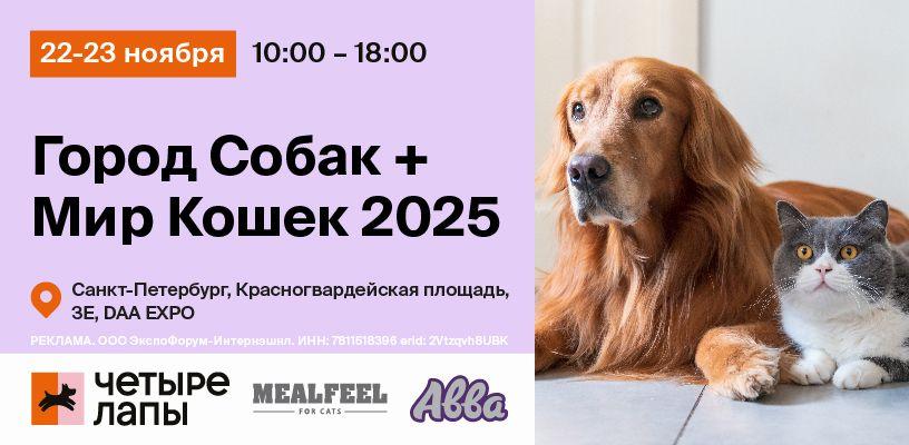 Приглашаем на крупнейшую выставку собак и кошек «Город Собак + Мир Кошек 2025», которая пройдет 22 и 23 ноября с 10:00 до 18:00, по адресу:г. Санкт-Петербург, Красногвардейская площадь, 3Е, DAA EXPO.