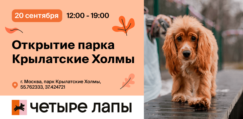 Конечно, вы можете прийти вместе с питомцем, ведь «Крылатские холмы» – это место, где рады всем! Ну а компания Четыре Лапы с удовольствием поможет организаторам своей поддержкой – для того, чтобы пет-родители и их любимцы были довольны мероприятием.