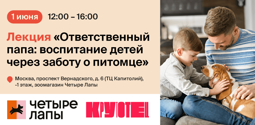 Приглашаем на интерактивный семинар «Ответственный папа: воспитание детей через заботу о питомце» от Четыре Лапы и проекта КрутОтец.