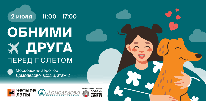 Четвероногие друзья ждут вас 2 июля в аэропорту Домодедово: второй этаж, общая зона пассажирского терминала, сегмент Т1 (ориентир — вход №3)