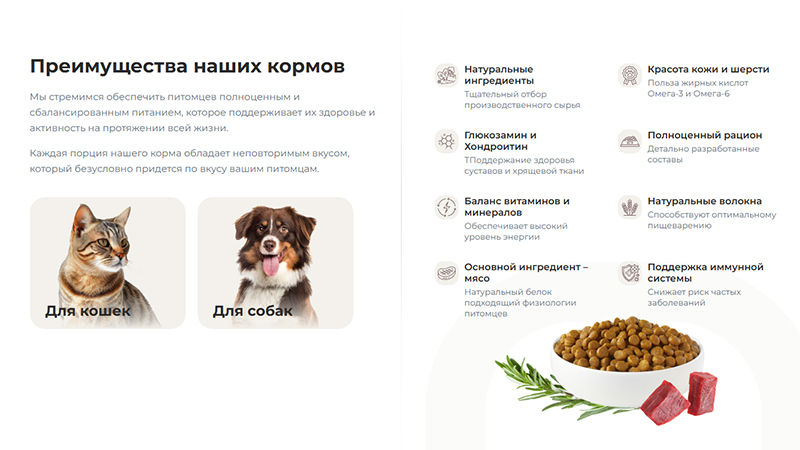 1. Корма данного бренда полезны для здоровья питомцем, так как изготавливаются из натуральных ингредиентов, сбалансированы по составу и удовлетворяют ежедневные потребности собак и кошек в витаминах и минералах.