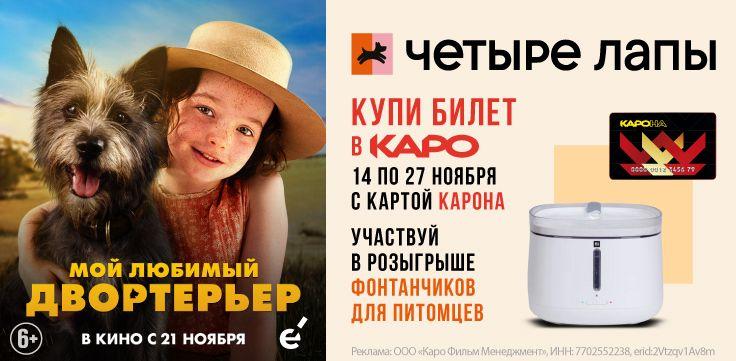 С 14 по 27 ноября смотрите трогательный семейный фильм «Мой любимый двортерьер» с картой лояльности КАРОНА и участвуйте в розыгрыше питьевых фонтанчиков для питомцев.