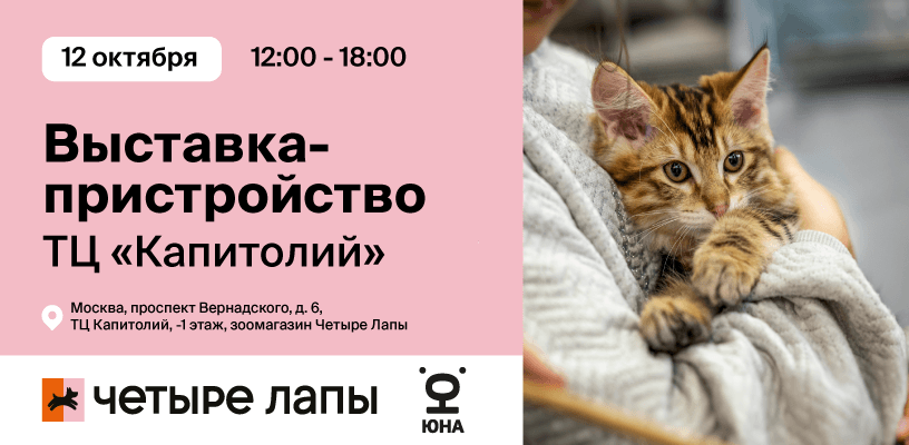 В воскресенье, 12 октября, в ТЦ «Капитолий» вместе с Центром реабилитации временно бездомных животных «Юна» мы проведем мини-выставку животных из приюта.