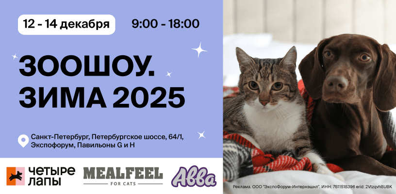 Приглашаем на крупнейшую выставку собак, кошек, грызунов и рептилий «ЗООШОУ. ЗИМА 2025», которая пройдет 12-14 декабря, с 9:00 до 18:00, по адресу: г. Санкт-Петербург, Петербургское шоссе 64/1, Эксопофрум, Павильоны G и H.