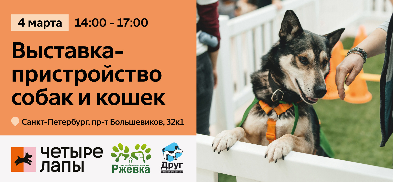 В выставке примут участие 7 собак и 5 кошек из приютов «Ржевка» и «Друг», г. Санкт-Петербург.