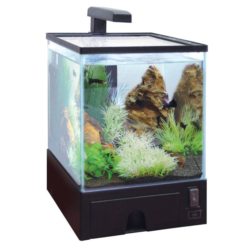 Аквариум из силикатного стекла. В комплекте: светильник 1*1Вт LED, помпа 200л/ч, адаптор, покровное стекло. Аквариум оборудован выдвижным ящиком для хранения.