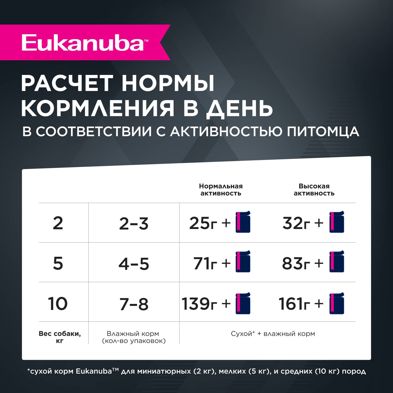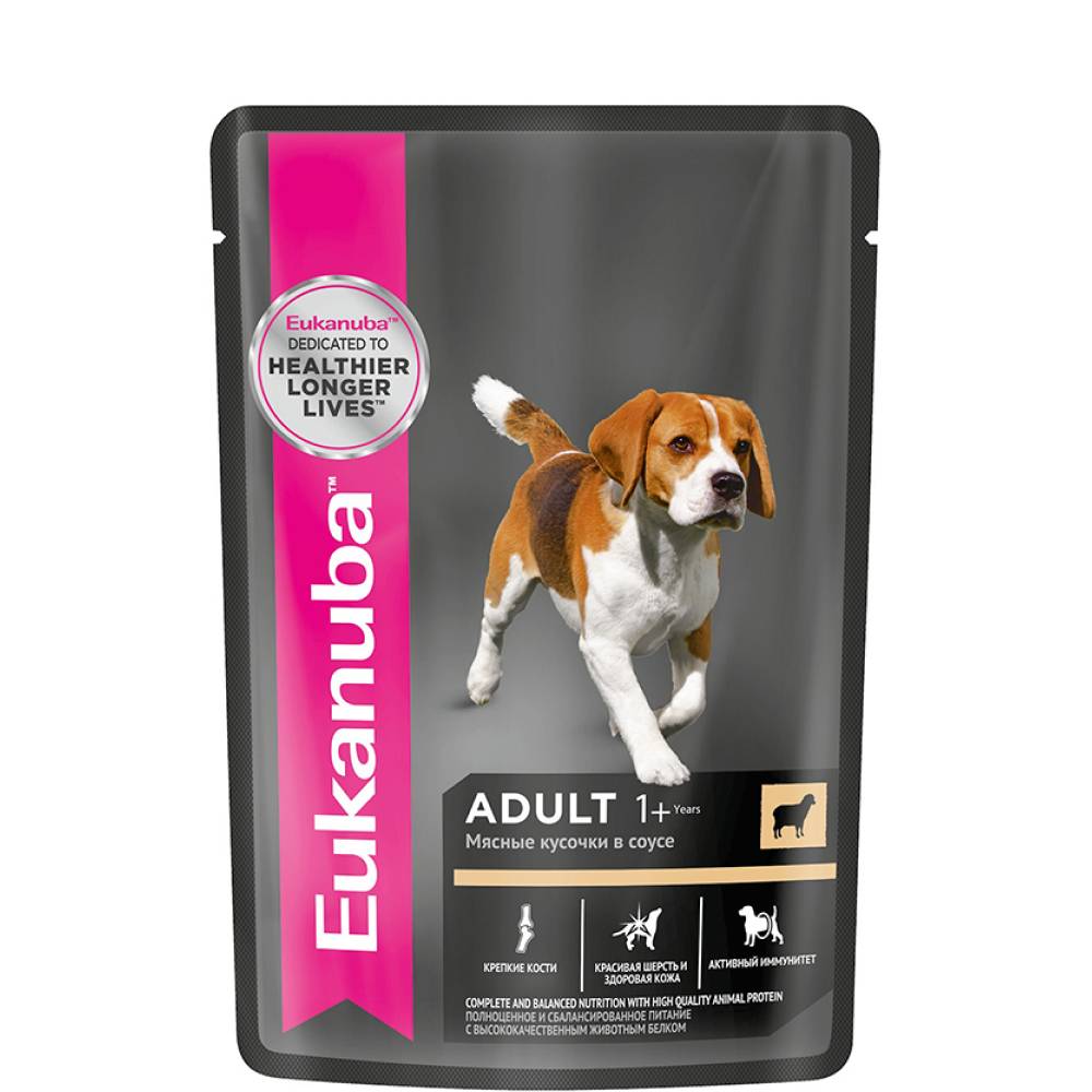 cочетание влажного и сухого рационов - залог здоровья собаки. Влажные рационы способствуют профилактике мочекаменной болезни, поддерживают оптимальный водный баланс, снижают риск ожирения, а так же помогают обеспечить разнообразие питания собак. Включайте влажные рационы Eukanuba® в ежедневное питание вашего питомца!