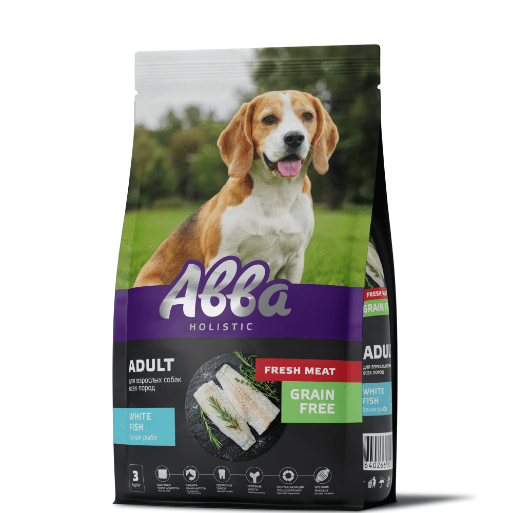 АВВА Holistic Grain Free с белой рыбой – полнорационный сухой корм для собак всех пород, изготовлен с добавлением свежей рыбы (24%). Разработан в качестве универсального корма, состав которого подойдет любой собаке, не зависимо от возраста и породы. Рацион АВВА Grain Free приготовлен без использования злаков, что снижает вероятность возникновения аллергических реакций.