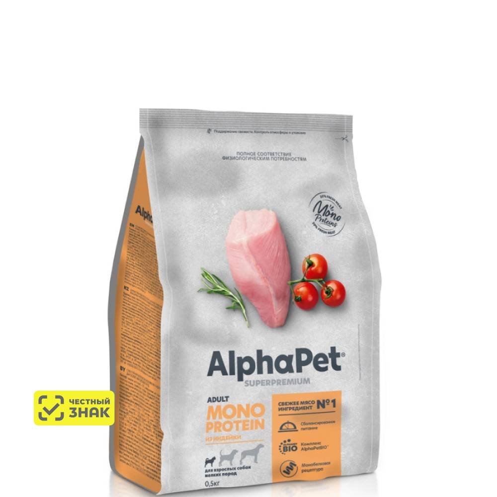 AlphaPet Monopronein Superpremium Сухой корм для взрослых собак мелких пород, с индейкой, 500 гр.