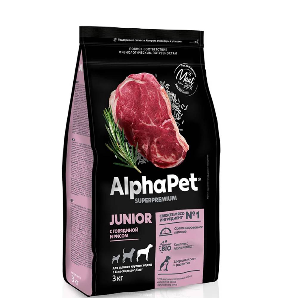 Сухой полнорационный корм с говядиной и рисом для щенков крупных пород с 6 месяцев до 1,5 лет AlphaPet Superpremium.