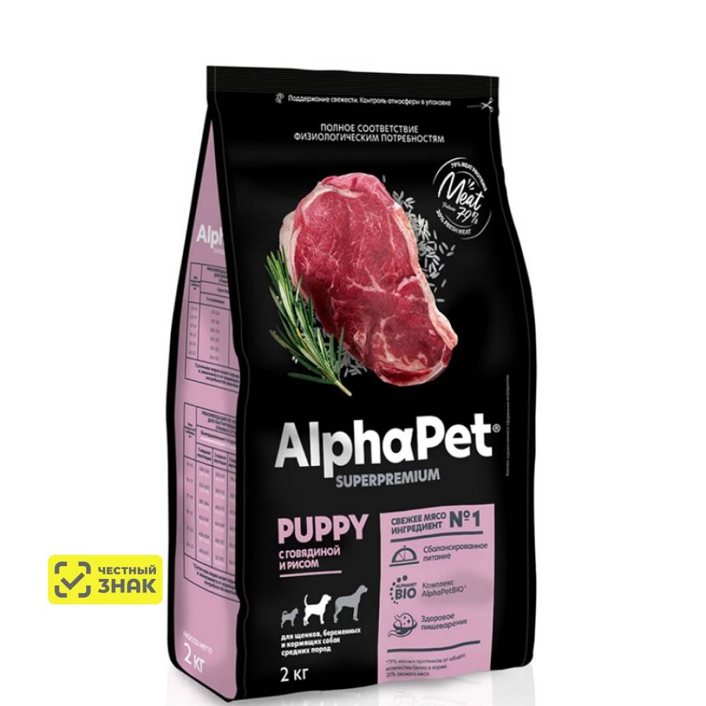 Сухой полнорационный корм с говядиной и рисом для щенков, беременных и кормящих собак средних пород AlphaPet Superpremium.