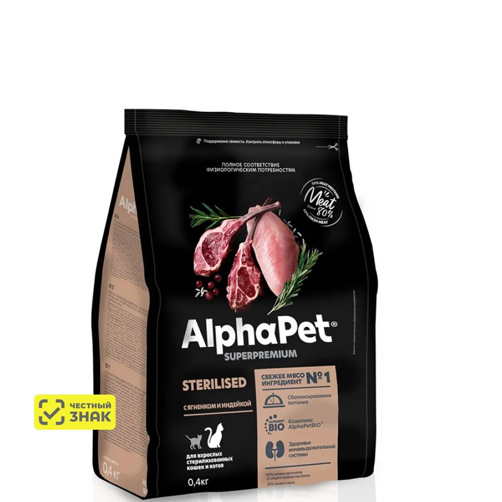 AlphaPet Сухой корм для стерилизованных кошек, с ягненком и индейкой, 400 гр.