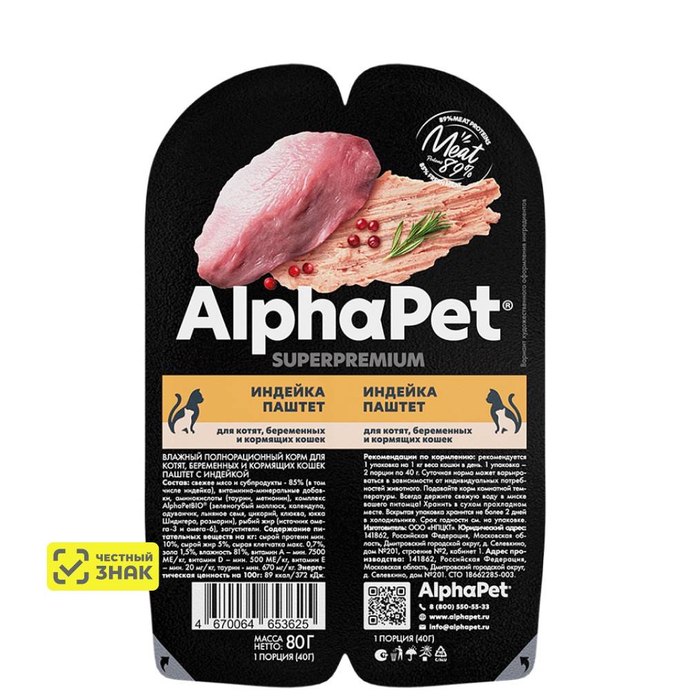 AlphaPet Влажный корм (блистер) для котят, беременных и кормящих кошек, паштет с индейкой, 80 гр.
