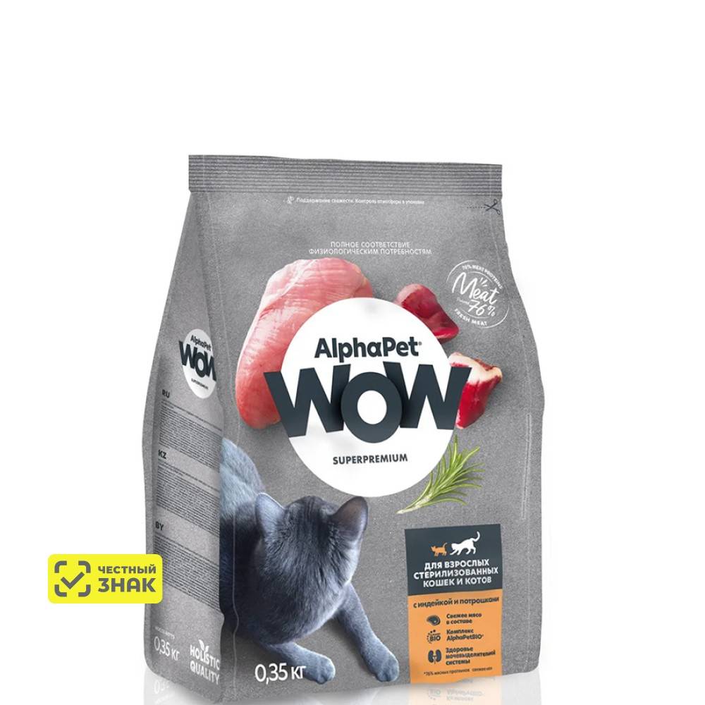 Сухой полнорационный корм с индейкой и потрошками для взрослых стерилизованных кошек и котов AlphaPet WOW Superpremium.