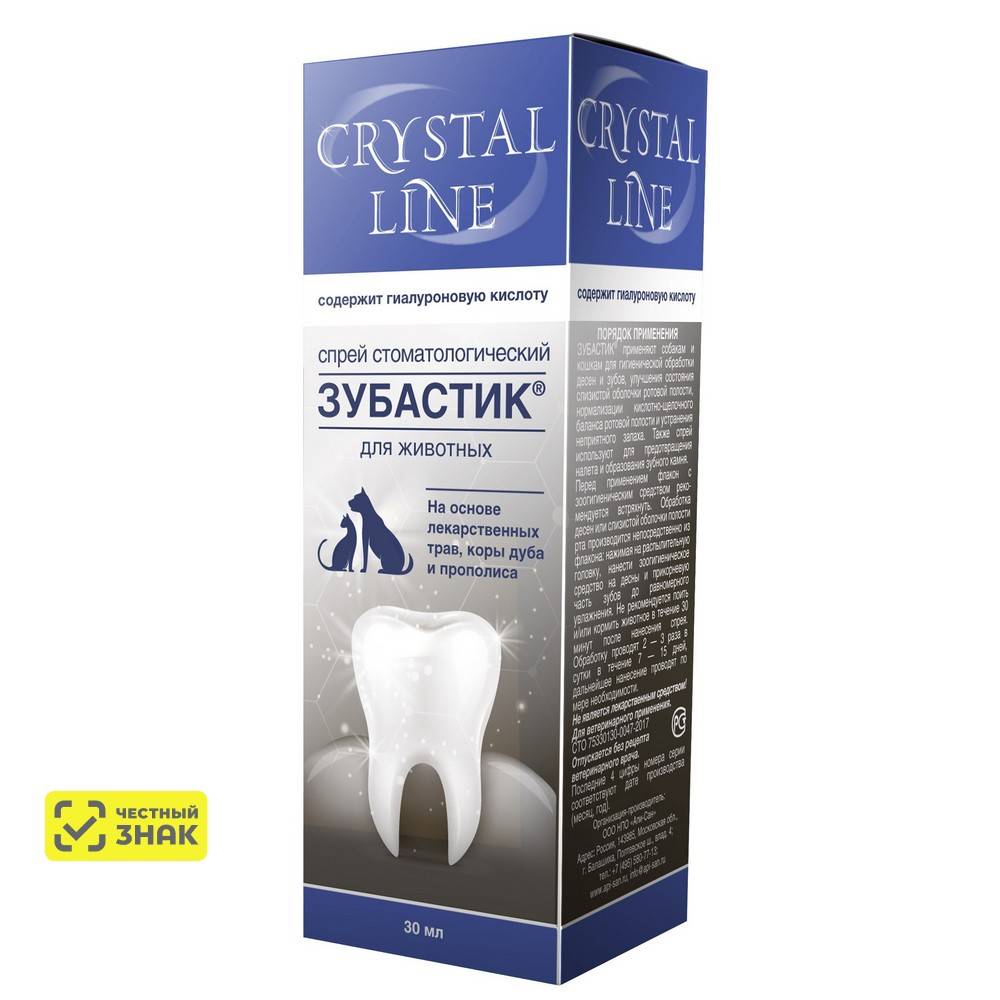 Crystal Line Зубастик спрей стоматологический применяют собакам и кошкам для гигиенической обработки десен и зубов, улучшения состояния слизистой оболочки ротовой полости, нормализации кислотно-щелочного баланса ротовой полости и устранения неприятного запаха. Также гель и спрей используют для предотвращения налета и образования зубного камня.