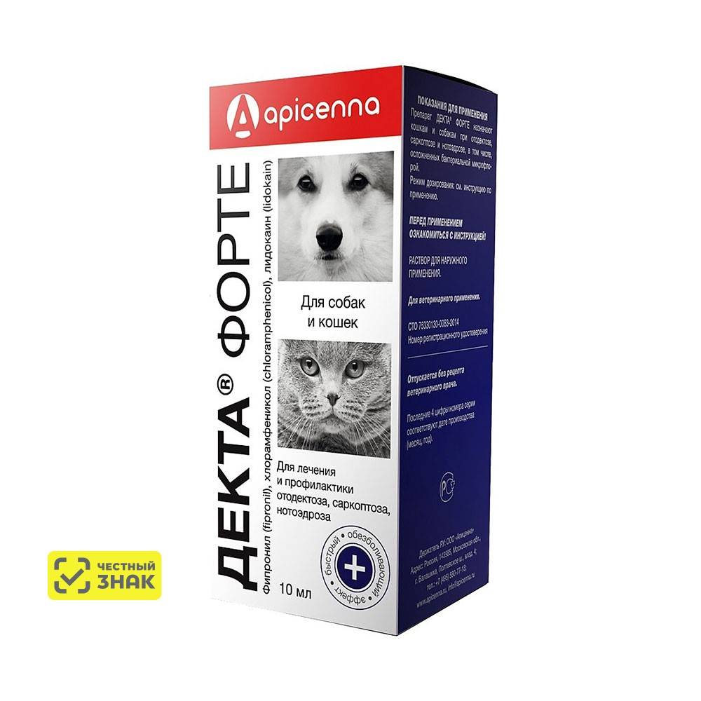 Декта Форте назначают собакам и кошкам при отодектозе, саркоптозе и нотоэдрозе, в том числе, осложненных бактериальной микрофлорой.