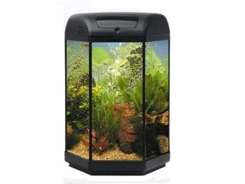 Шестиугольный аквариумный комплект, с полным оснащением и переливным фильтром, установленным в крышке. Идеален как демонстрационный аквариум.