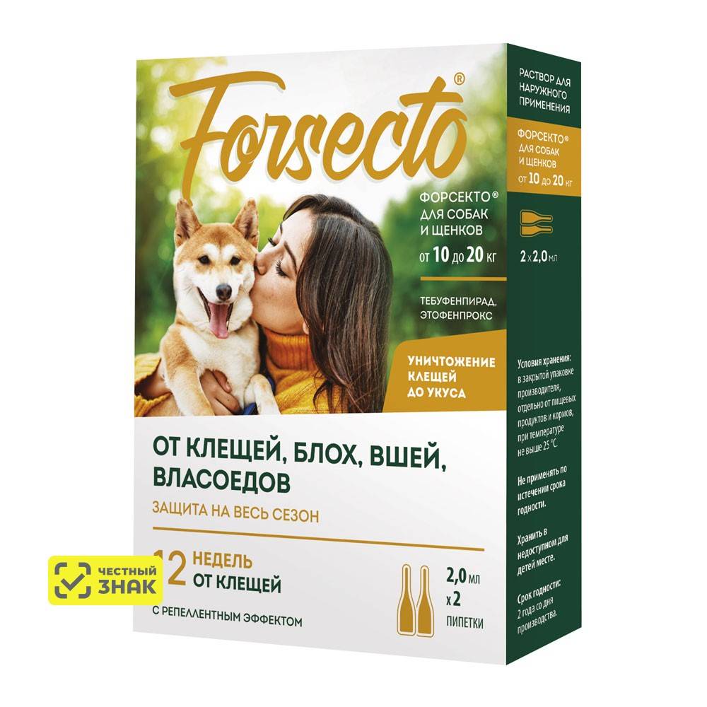 FORSECTO – инсектоакарицидный препарат для защиты собак и щенков от внешних паразитов (клещей, комаров, блох, вшей, власоедов) обладает уникальным комплексом действующих веществ - Тебуфенпирада и Этофенпрокса.