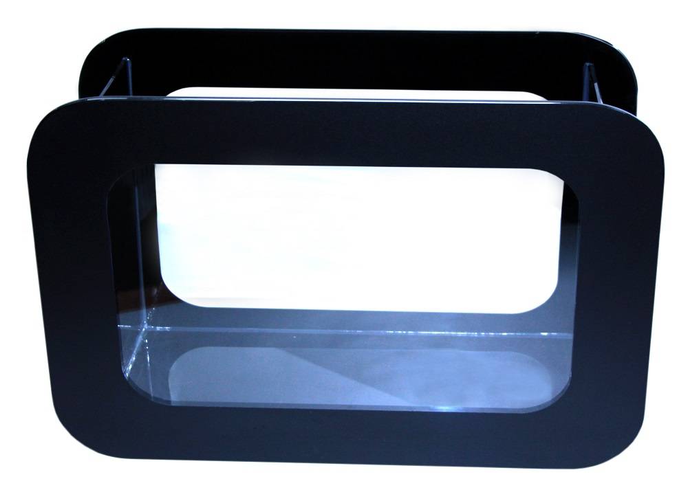 Настольный аквариум «Калейдоскоп». Внешняя рамка, боковые стенки и дно аквариума окрашены водостойкой УФ- краской. Для надежности изготавливается из стекла 6 мм. Размер 435*150*300 мм, объем 14 л.