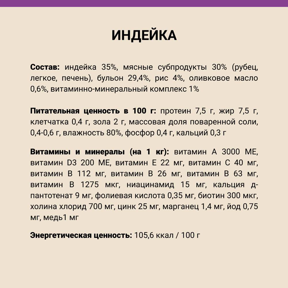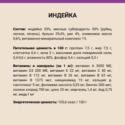 индейка 35%, мясные субпродукты 30% (рубец, легкое, печень), бульон 29,4%, рис 4%, оливковое масло 0,6%, витаминно-минеральный комплекс 1%.