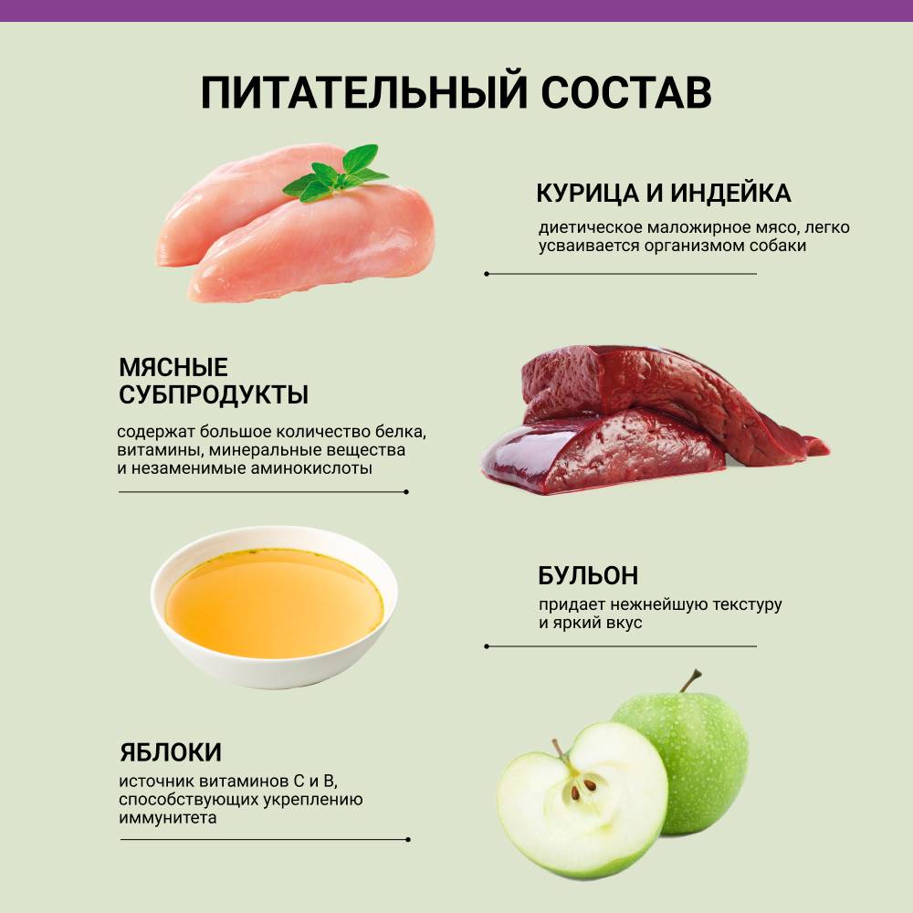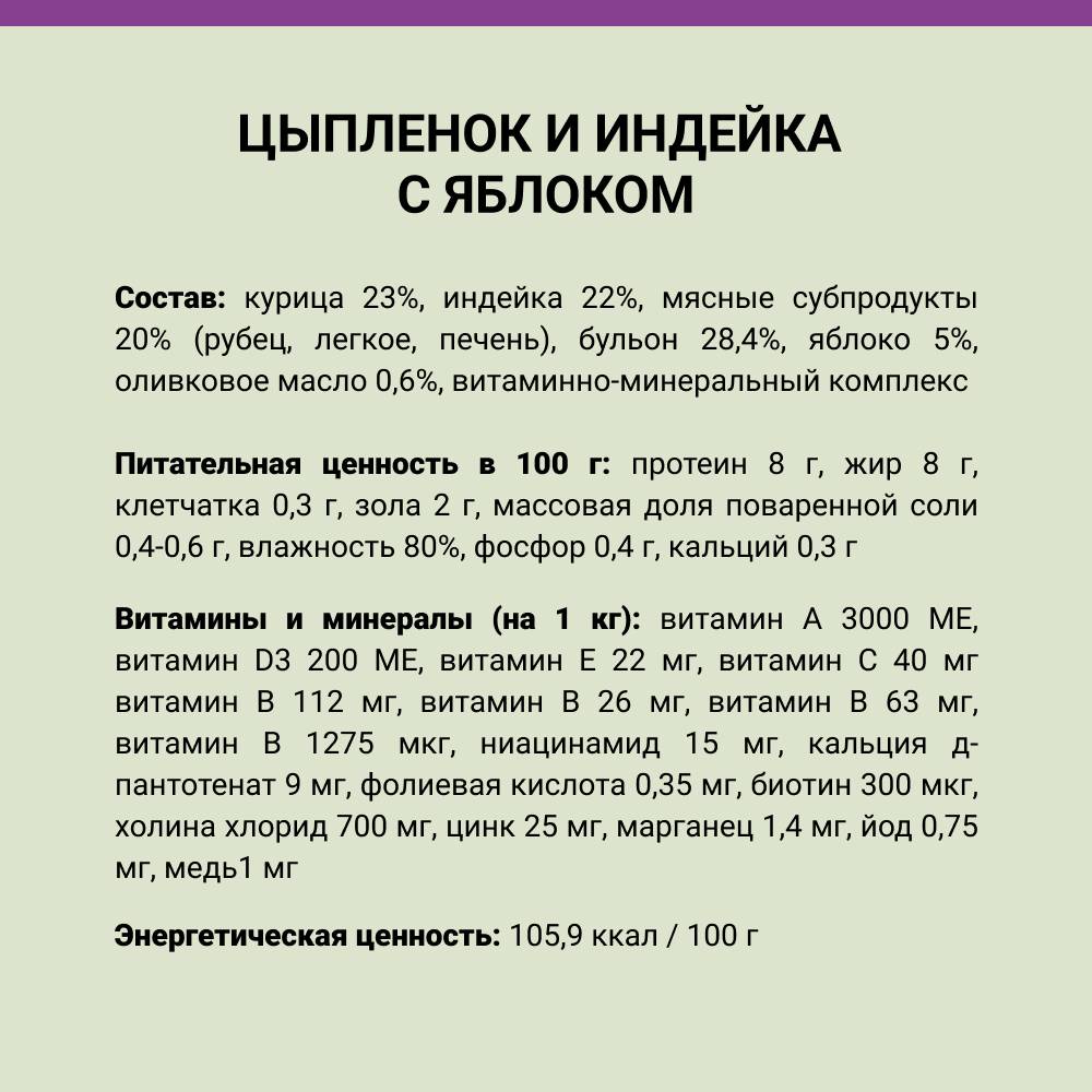 курица 23%, индейка 22%, мясные субпродукты 20% (рубец, легкое, печень), бульон 28,4%, яблоко 5%, оливковое масло 0,6%, витаминно-минеральный комплекс 1%.