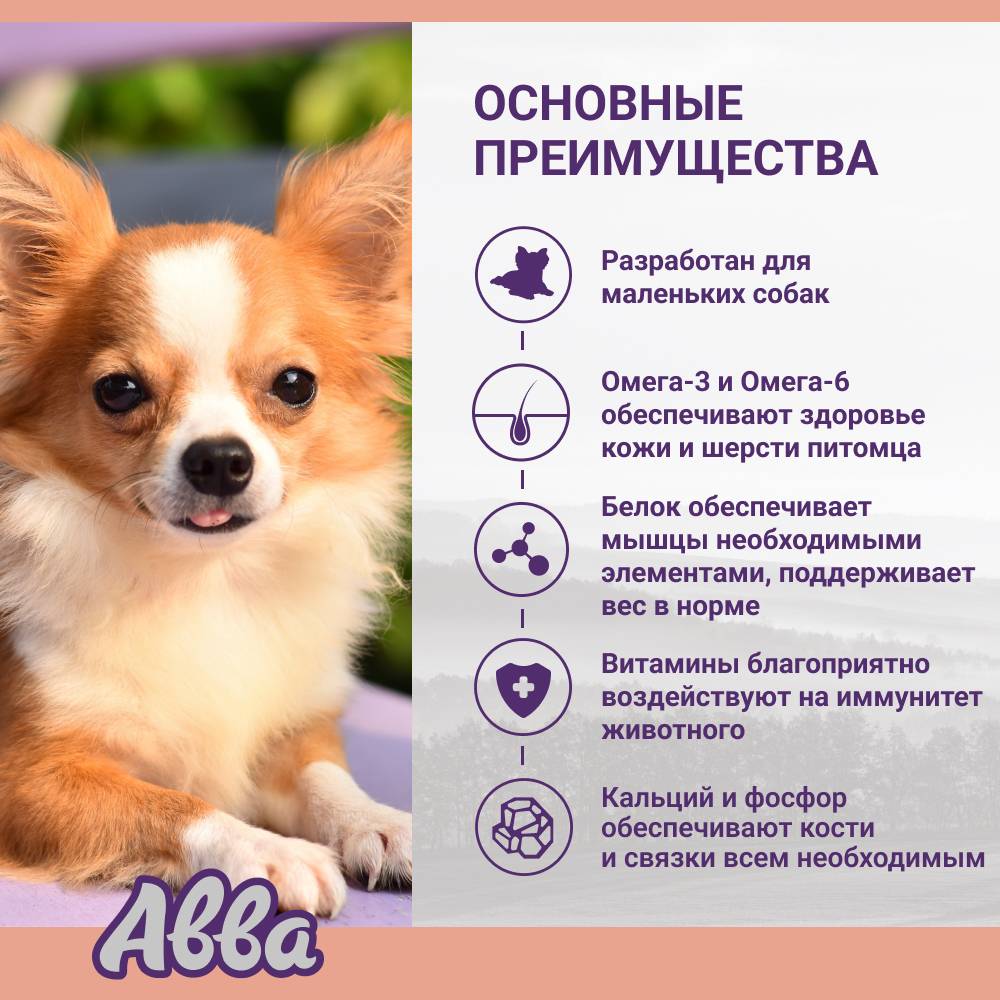Корм для таких собак должен иметь высокую концентрацию всех необходимых элементов питания, достаточно нежную мелкую текстуру, учитывая небольшой размер челюсти питомца. Всё это учтено в корме «АВВА». Удобная небольшая упаковка не требует хранения в холодильнике (в закрытом виде), имеет долгий срок годности, для того, чтобы ее открыть не понадобится консервный нож.