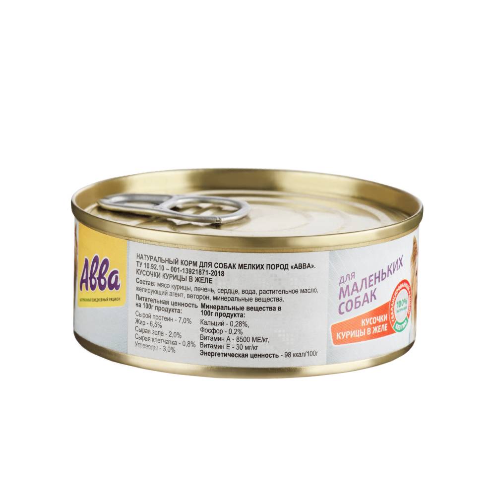 Натуральный корм для собак мелких и карликовых пород АВВА кусочки курицы в желе учитывает особенности питания подобных животных. Для полноценной и активной жизни, ваши домашние животные небольшого размера должны получать достаточно питательных элементов и витаминов, но при этом, по причине своего размера, объем их желудка не велик.