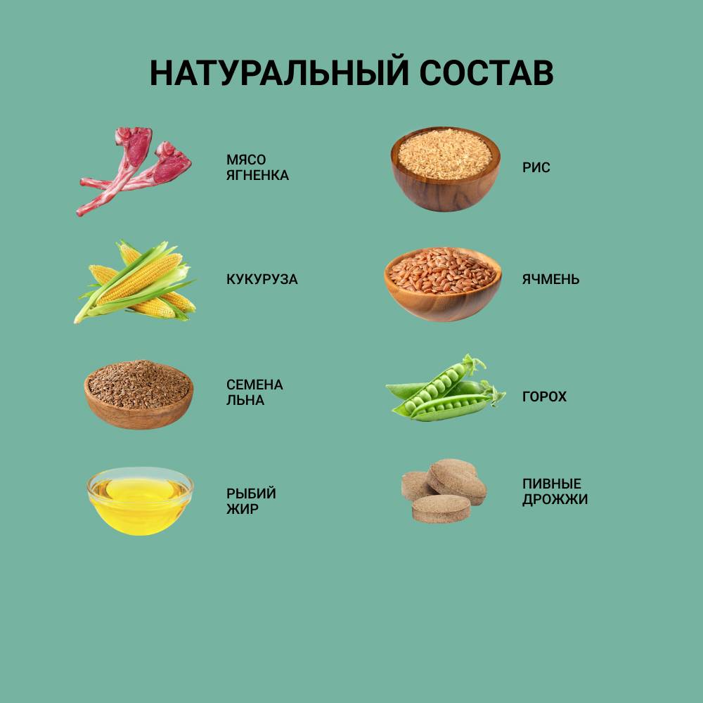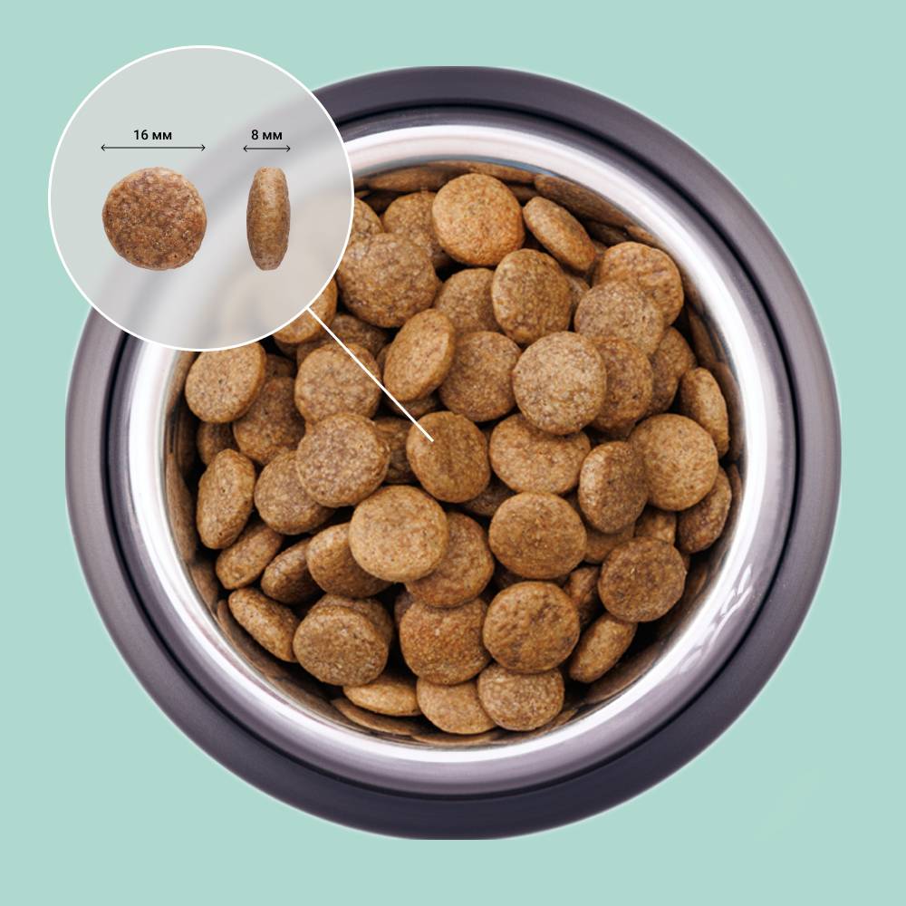 - Здоровье кожи и шерсти питомца обеспечивается благодаря содержанию в составе корма полезных жирных кислот Омега-3 и Омега-6.
