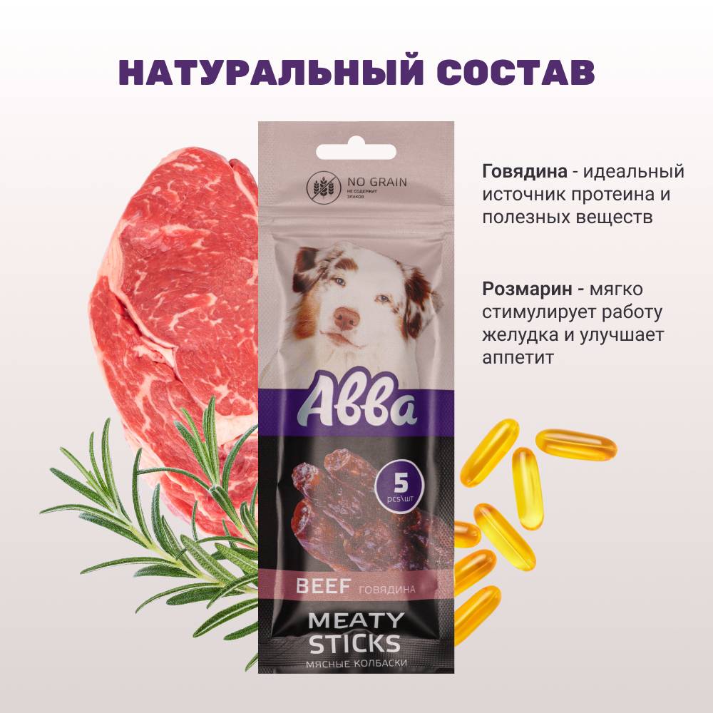 Мясные колбаски АВВА – это идеальный источник протеина и полезных веществ для вашей собаки, а также вкусное поощрение во время дрессировки. Непревзойдённый вкус порадует даже самого требовательного гурмана.
