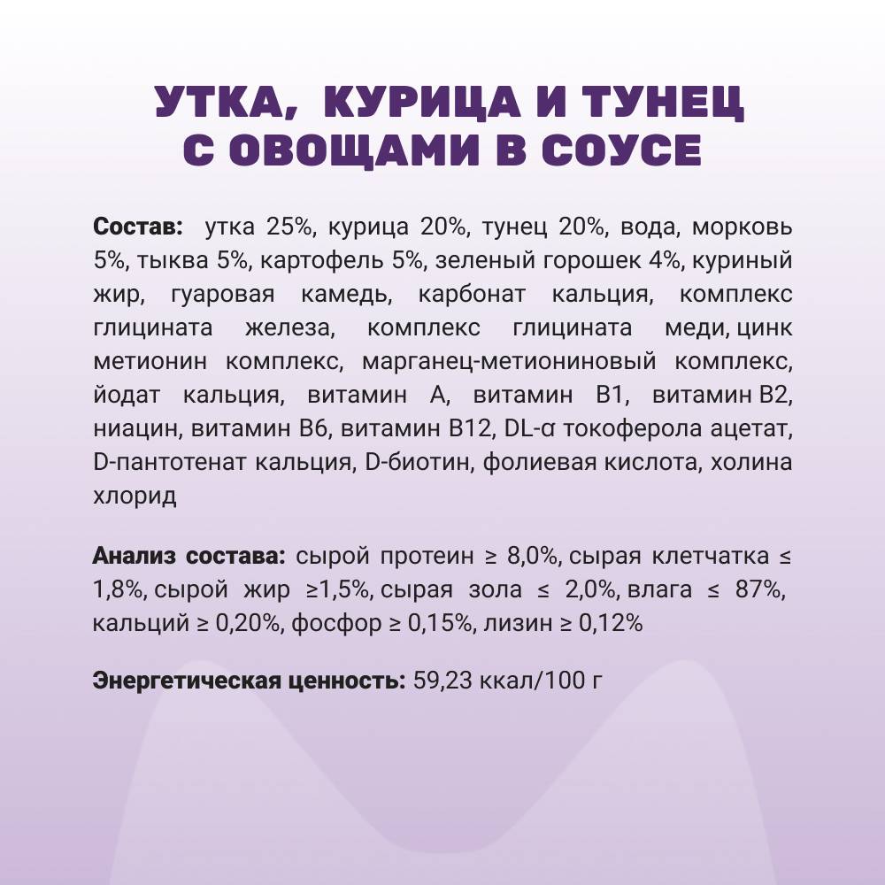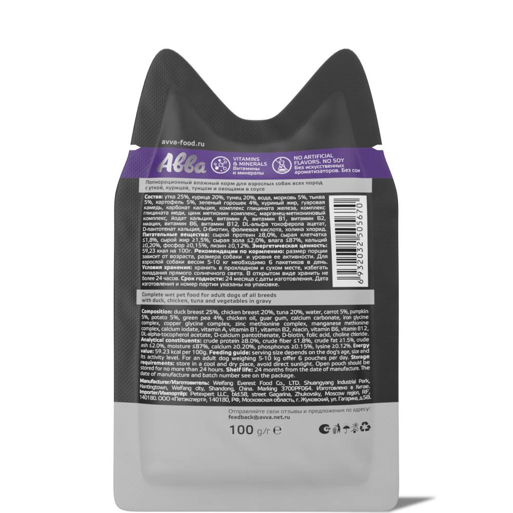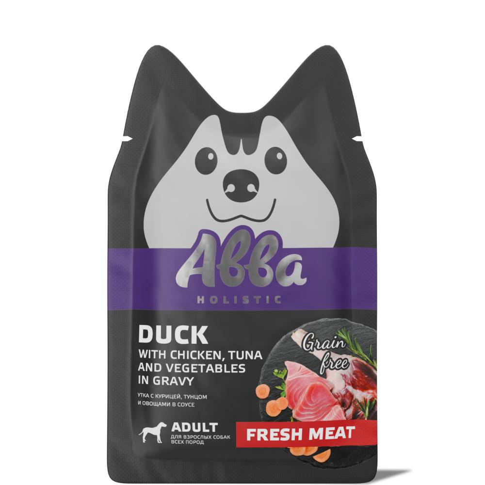 АВВА паучи с уткой, курицей, тунцом и овощами в соусе - полнорационный влажный корм для собак всех пород. Нежные волокна в аппетитном соусе, приготовленные до идеально мягкой консистенции, подарят истинное удовольствие вашему питомцу.
