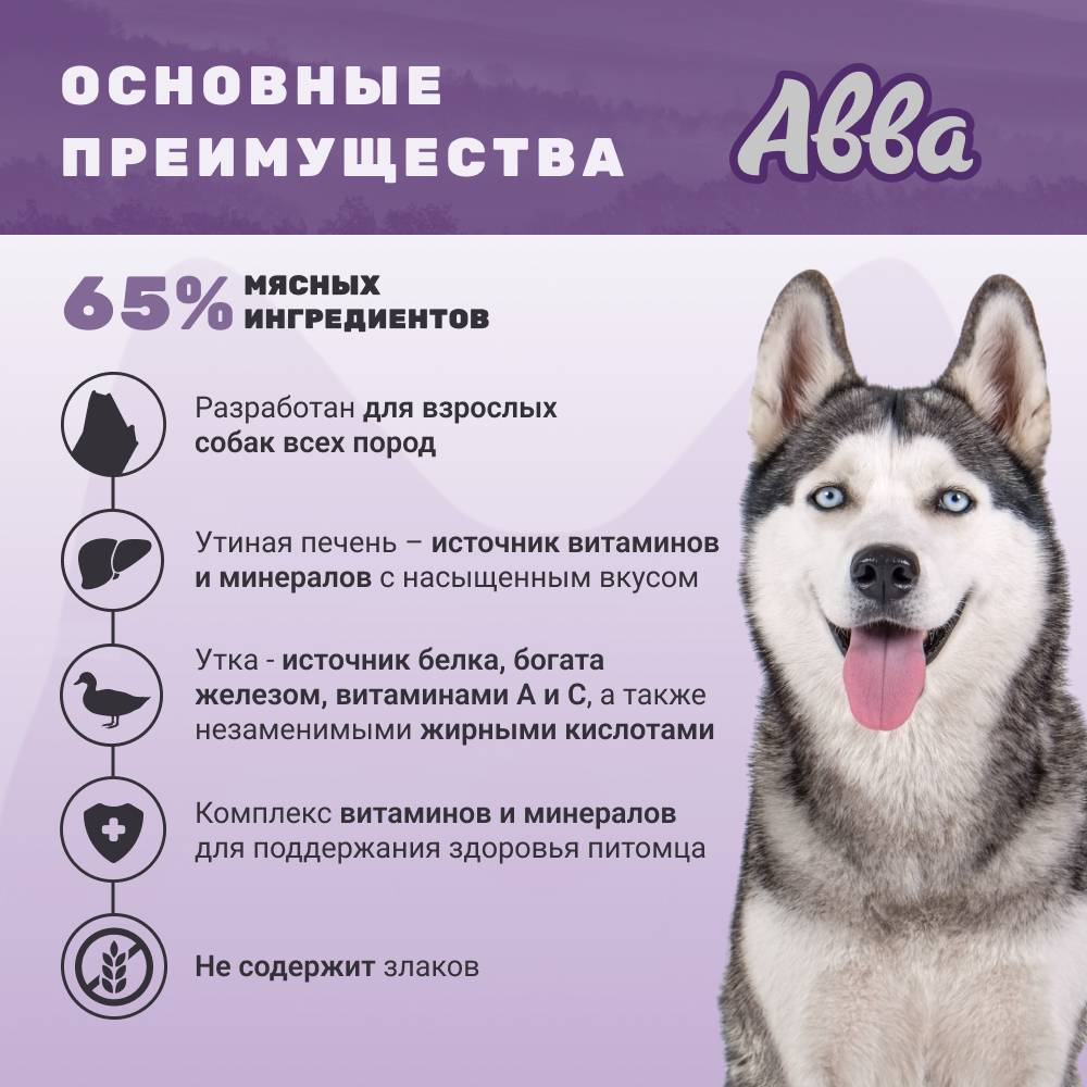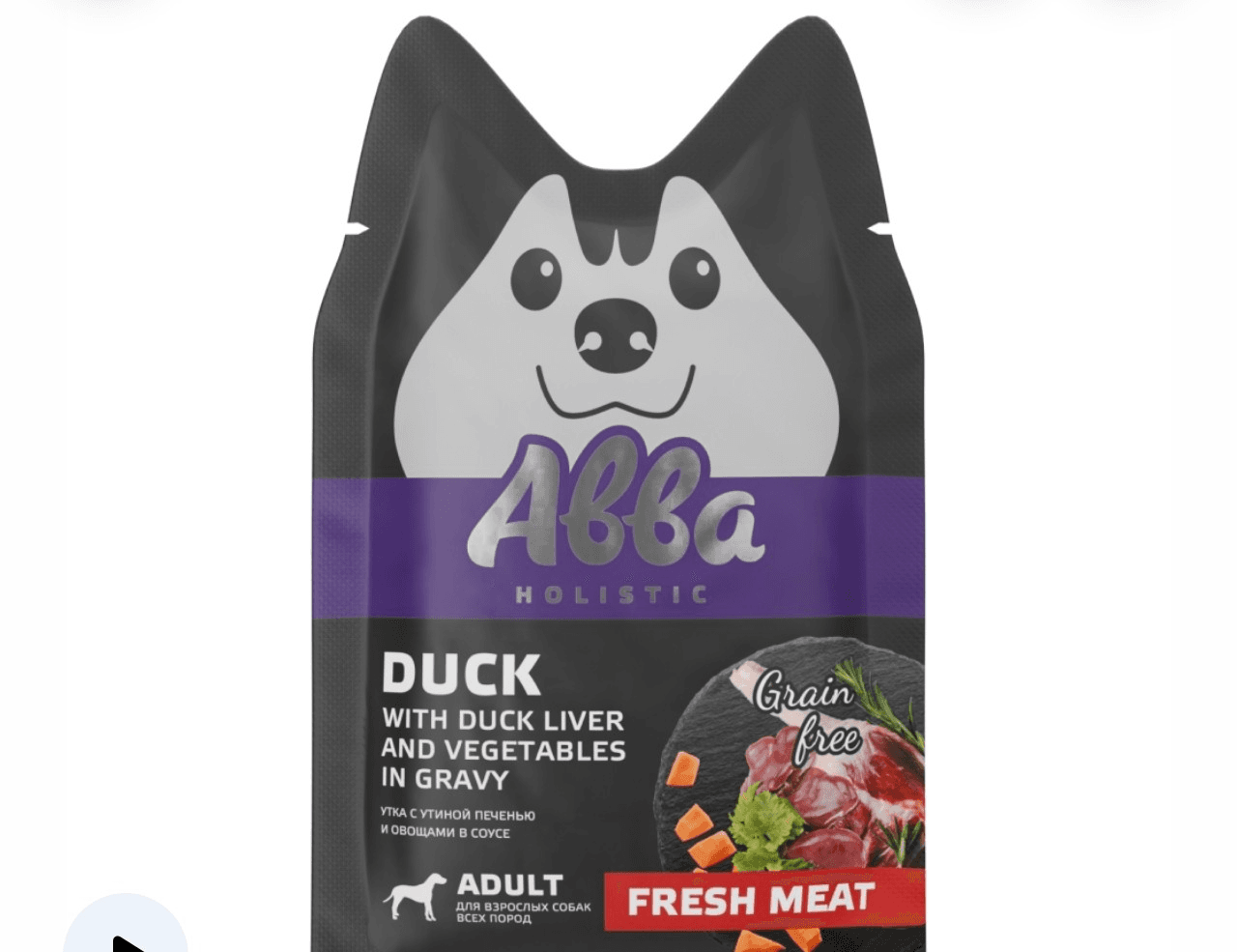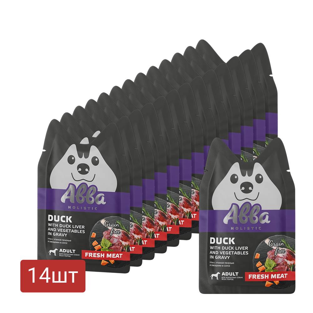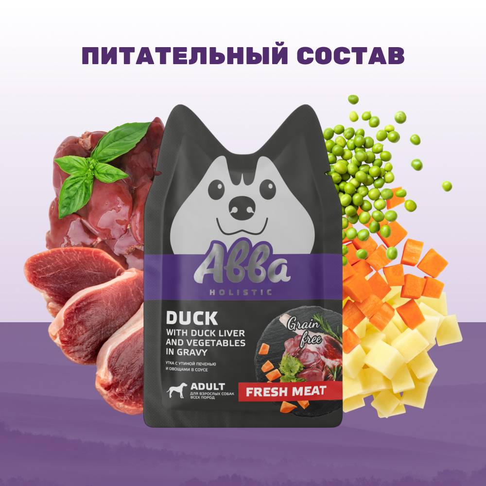 АВВА паучи с уткой, утиной печенью и овощами в соусе - полнорационный влажный корм для собак всех пород. Нежные мясные волокна в аппетитном соусе, приготовленные до идеально мягкой консистенции, подарят истинное удовольствие вашему питомцу.