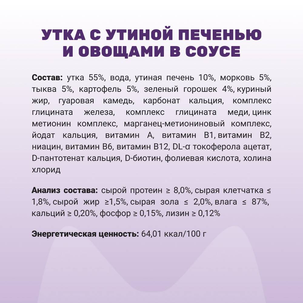 - Утка - источник высококачественного белка, богата железом, витаминами A и C, а также незаменимыми жирными кислотами - Омега-3 и Омега-6, которые благоприятно влияют на кожу и шерсть питомца.